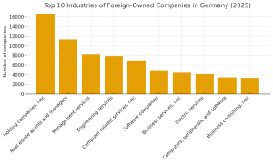 Among foreign-owned companies in Germany, the leading sectors are holding companies (16,681), real estate (11,359), and management services (8,193). Engineering services (7,853) and IT-related activities such as computer services (6,983) and Software companies (4,944) also rank highly. This reflects Germany’s role as both an industrial hub and a center for professional and digital services.