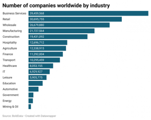 ‘Business Services’ is the world’s largest industry, with 39,45 million companies. Retail is the second largest industry with 30,69 million companies. Followed by 26,67 million wholesale companies and 21,72 million manufacturing companies. 1 out of 3 manufacturers are based in China. With 7,263,459 manufacturing companies China is definitely the world’s factory. This is 4 times the number of manufacturers in USA.