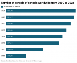 Amsterdam, 21 January 2021 – Sunday is International Day of Education. A day in celebration of the role of education for peace and development. Time to study the numbers! BoldData presents the trends in the international Education Industry. From the rise of Business Schools worldwide to the decrease of schools in Europe.