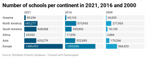 Most schools can be found on the European continent: almost 2 million. However – for the first time ever – the number of European schools decreased. In 2020 we saw a decrease of 447 schools. France tops the European list with 226,175 schools. The United Kingdom follows closely with 223,887 schools.